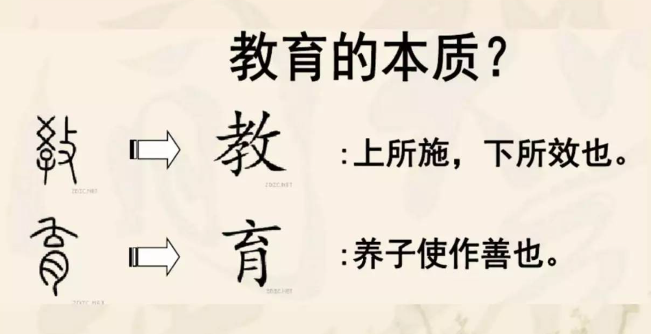东汉许慎在其所著《说文解字》中解释道:“教,上所施,下所效也。”“育,养子使作善也。”【善:道德。“教”指的是上面做示范,下面来模仿;“育”则是指培养后代让他们多做好事。】